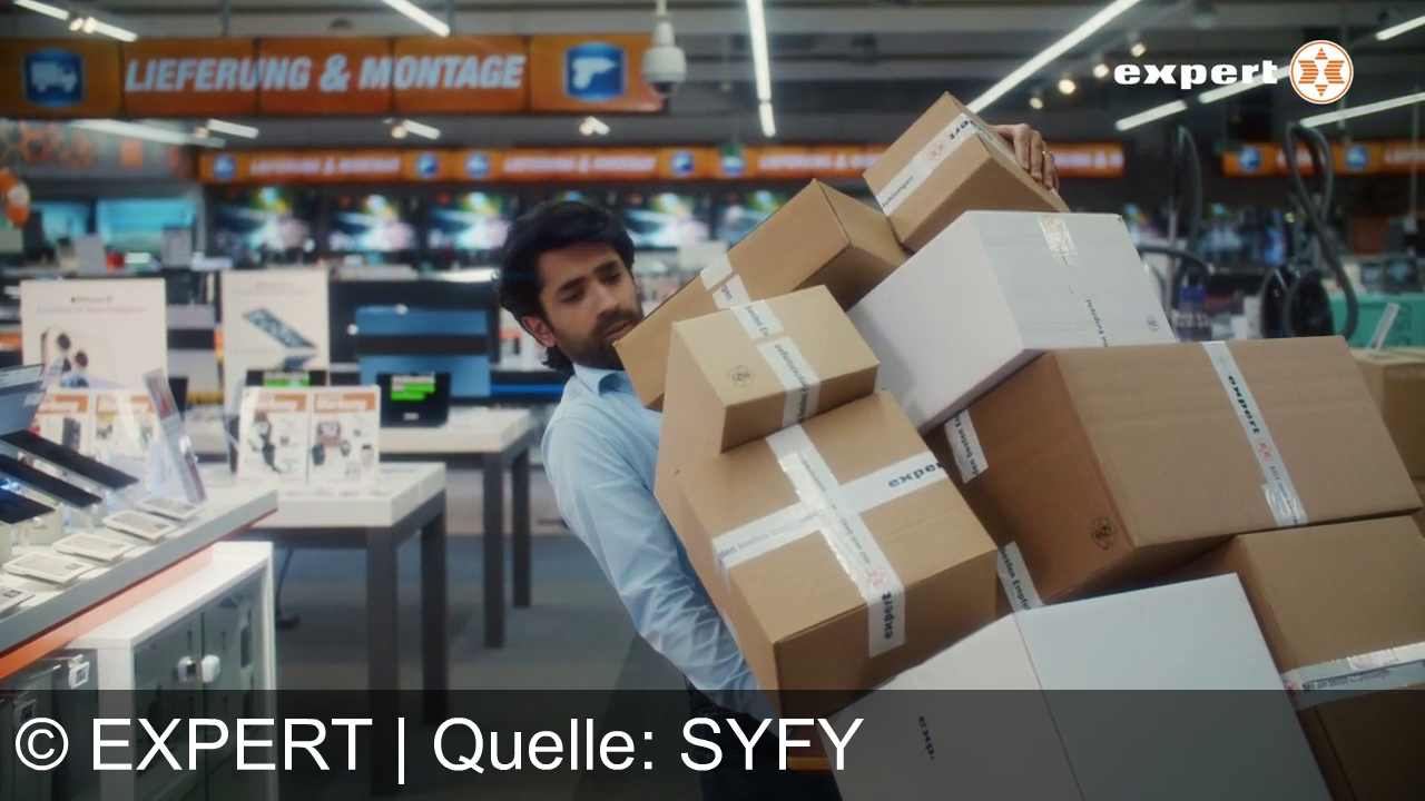 Ein Mann trägt viele Kartons durch ein Elektronikgeschäft. Im Hintergrund Regale mit Geräten und ein Schild „Lieferung & Montage“. Oben rechts das Logo von expert. Helle Deckenbeleuchtung und Tische mit ausgestellten Produkten.