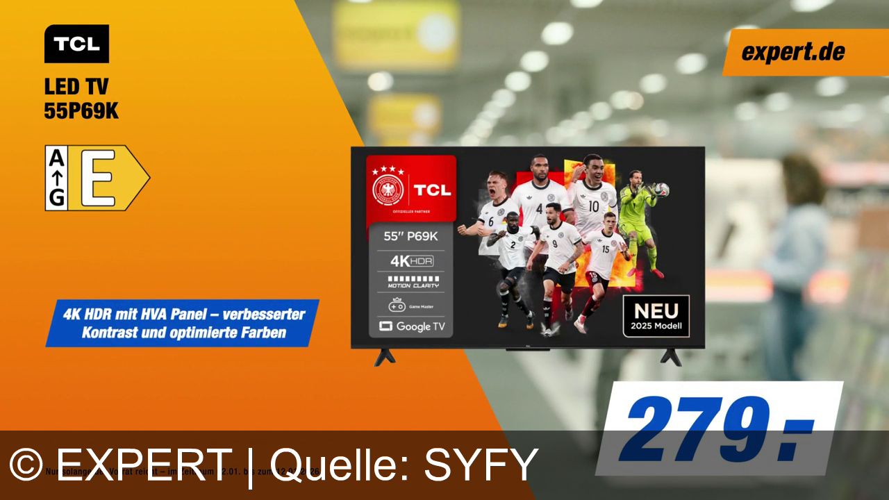 Eine TV-Werbung zeigt einen TCL LED TV 55P69K. Energieeffizienzklasse E. 4K HDR mit HVA Panel, besserer Kontrast und Farben. Google TV-Logo, 2025 Modell. Preis: 279 Euro. Auf einem Gerät sind Fußballspieler abgebildet. Links Expert.de-Logo, im Hintergrund ein unschärfer Kaufladen.