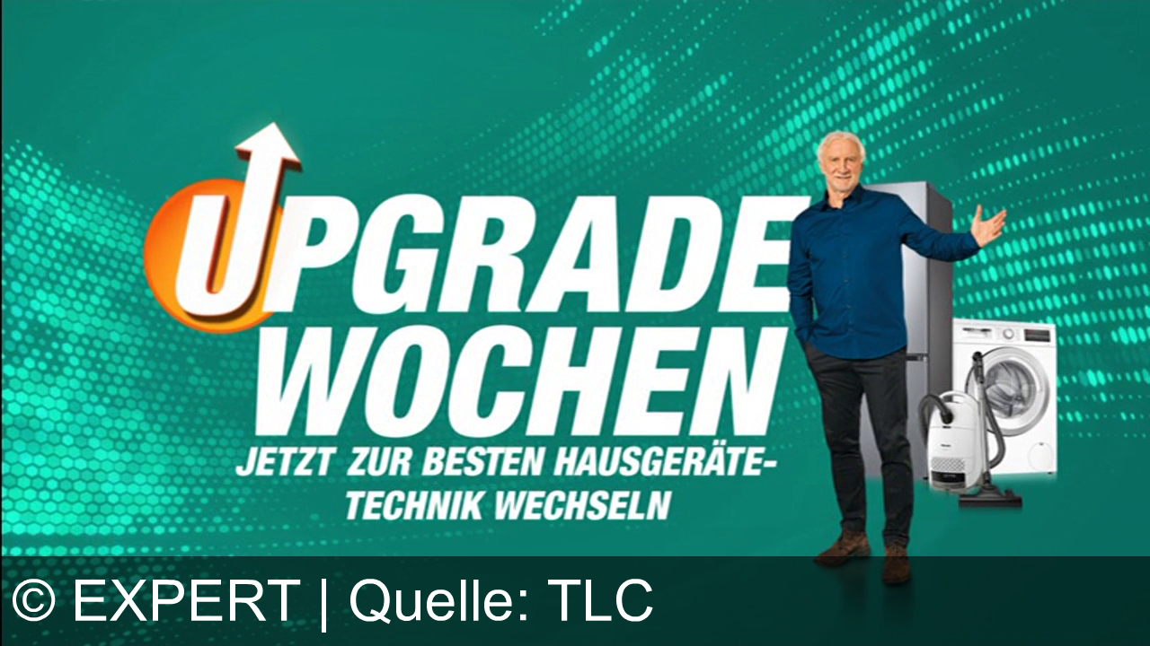 Ein Mann steht neben einem Kühlschrank, einer Waschmaschine und einem Staubsauger. Im Hintergrund ein grüner, gepunkteter Bildschirm. Große weiße und orangefarbene Schrift mit den Worten "UPGRADE WOCHEN JETZT ZUR BESTEN HAUSGERÄTE-TECHNIK WECHSELN".