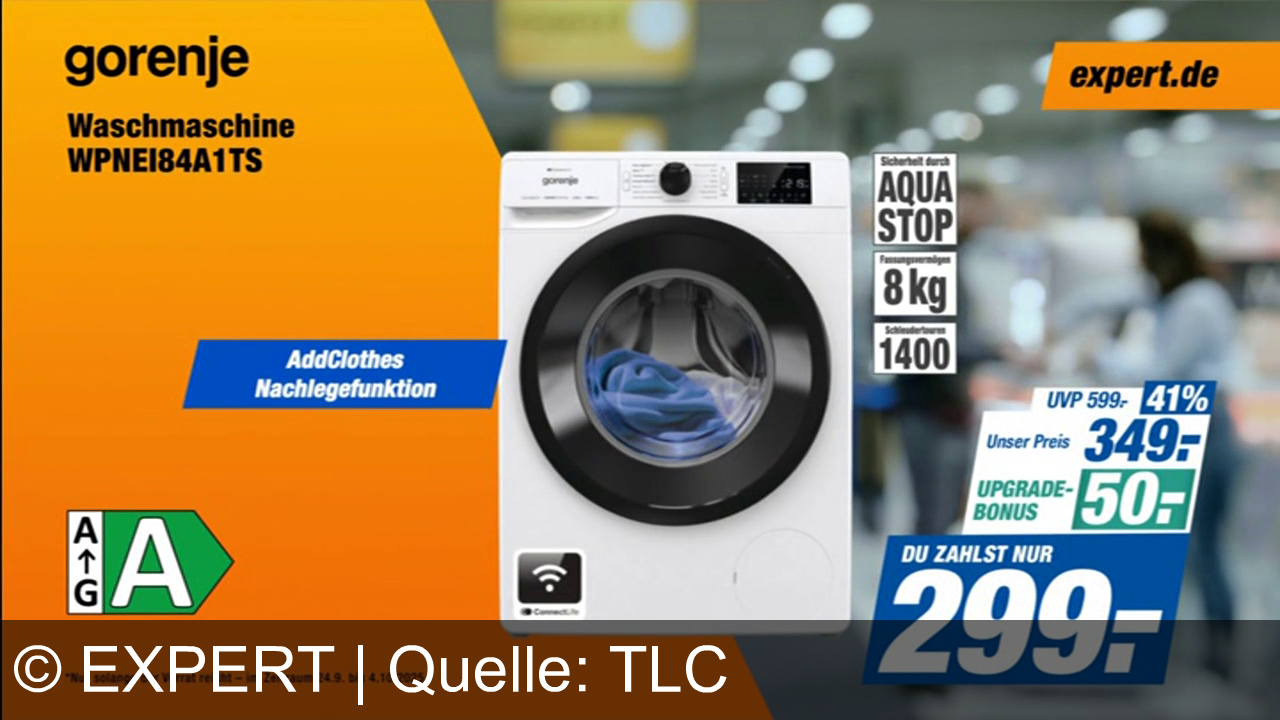 Gorenje Waschmaschine WPNEI84A1TS. Orange Hintergrund links, Maschine in der Mitte. AddClothes Nachlegefunktion beworben. AquaStop, 8 kg Fassungsvermögen, 1400 Schleudertouren. Energieeffizienzklasse A. Preis 299€ nach Upgrade-Bonus. Website expert.de oben rechts, Angebot gültig bis 4.10.2025, solange der Vorrat reicht.