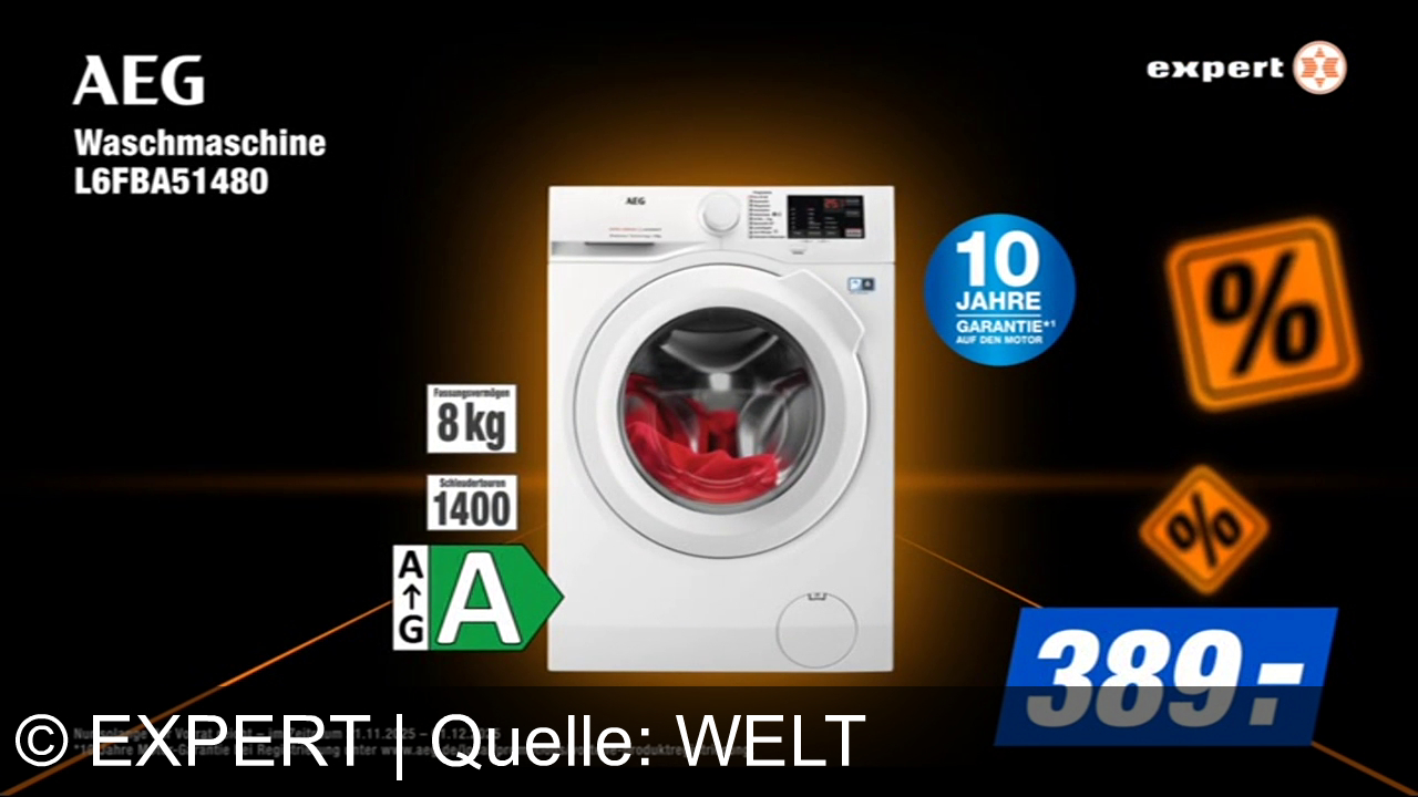AEG Waschmaschine L6FBA51480 im Bild, mit 8 kg Fassungsvermögen und 1400 Schleudertouren. Energieklasse A. Preis 389 Euro. 10 Jahre Garantie auf den Motor. Expert-Logo oben rechts. Orangenes Prozentzeichen im Hintergrund. Verkaufszeitraum 21.11.2025 bis 01.12.2025. Registrierung für Garantieleistung erforderlich.