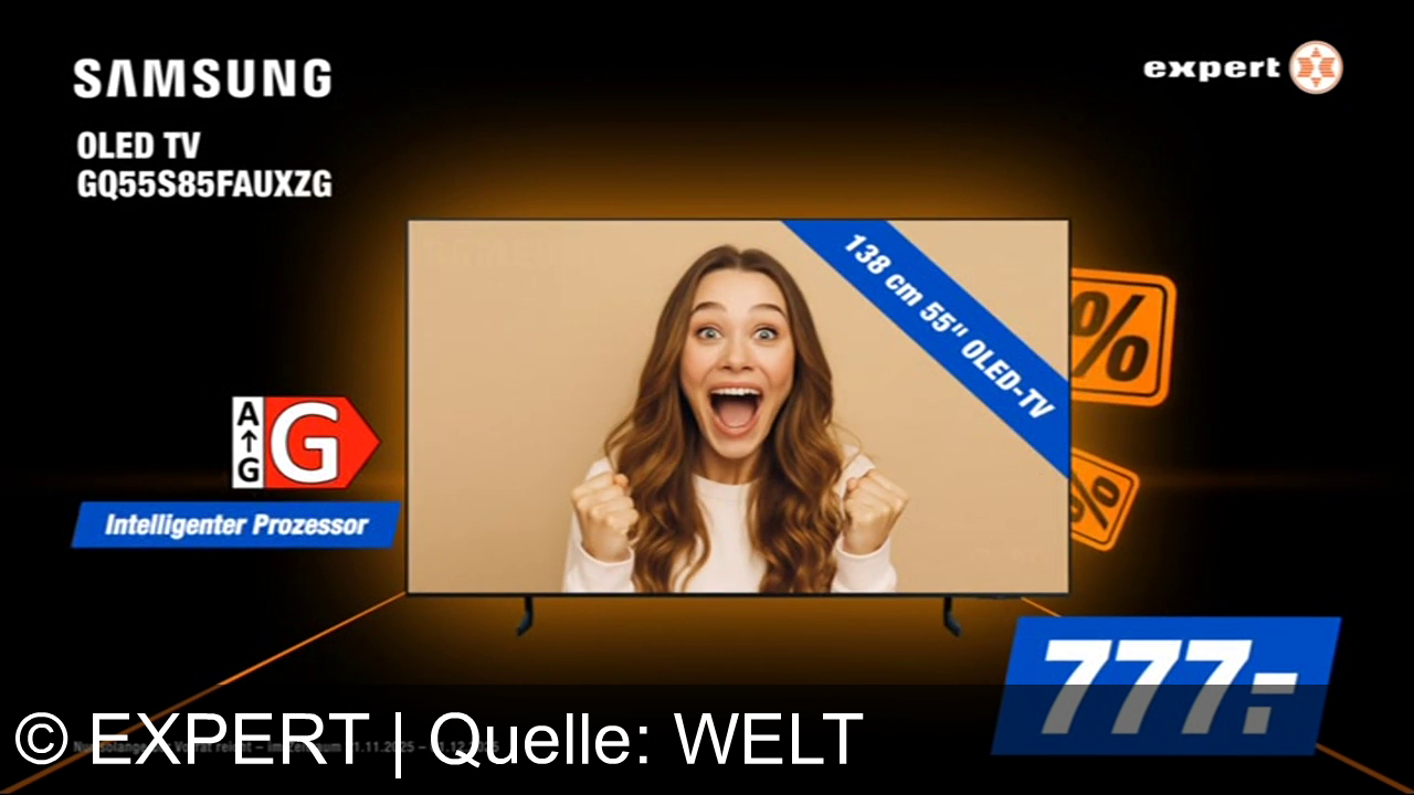 Samsung OLED TV GQ55S85FAUXZG, 138 cm (55"), mit intelligentem Prozessor. Eine Frau lacht begeistert. Preis: 777 Euro. Expert-Logo oben rechts. Angebotszeitraum 21.11.2025 bis 01.12.2025. Energieskala zeigt "G". Prozentzeichen im Hintergrund.
