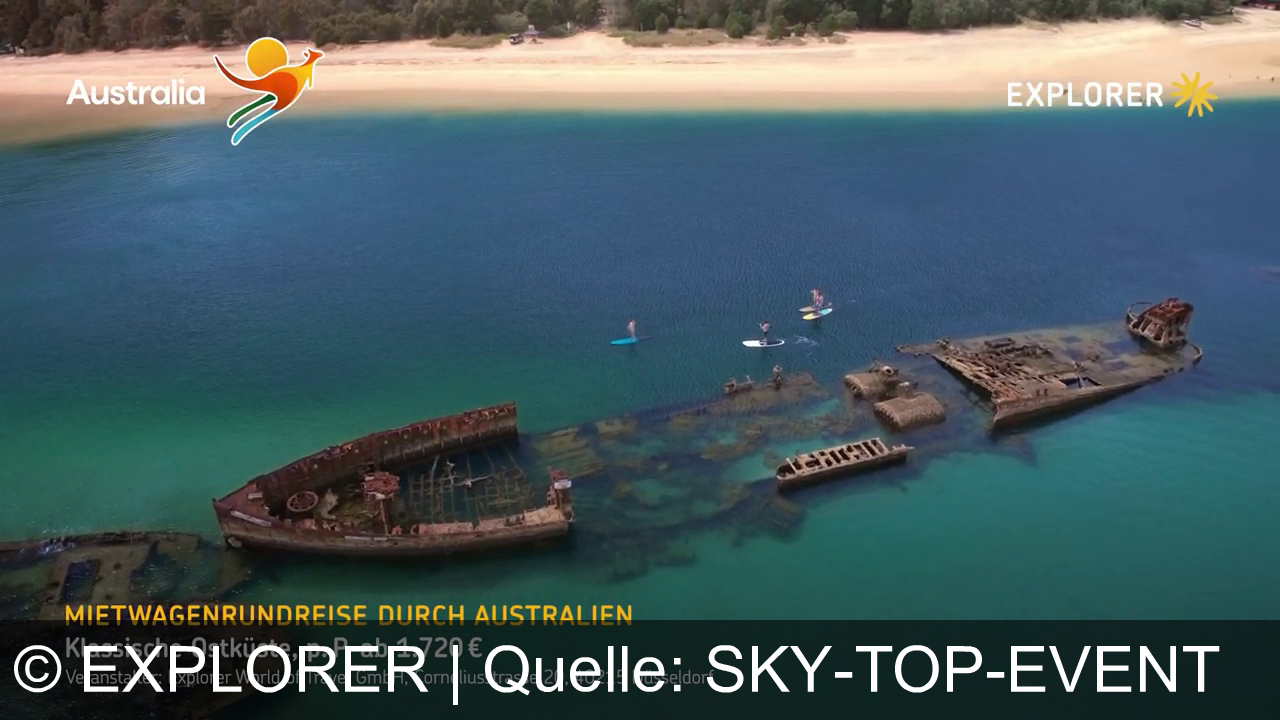 Ein paar Leute paddeln auf SUP-Boards über ruhiges blaues Wasser neben rostigen Schiffswracks. Im Hintergrund liegt ein breiter Sandstrand mit dichter Baumreihe. Werbung für eine Mietwagenreise ist eingeblendet.