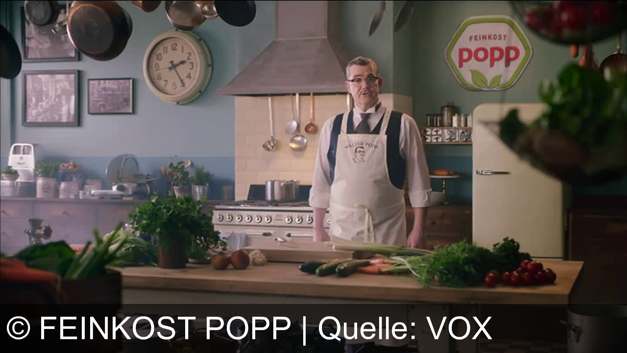 In einer Küche steht ein Mann mit Brille und Schürze. Auf dem Tisch liegen Gemüse und Kräuter. An der Wand hängt eine Uhr, über dem Herd Kochutensilien. Im Hintergrund ist ein Kühlschrank mit einem "Feinkost Popp"-Logo. Die Einrichtung wirkt altmodisch mit hängenden Töpfen und Pfannen.