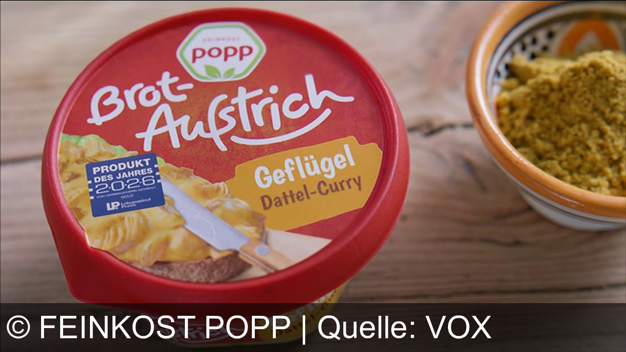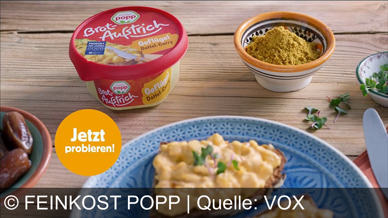Werbung aus dem Jahr 2026 von Feinkost Popp in Deutschland, mit dem von uns gewählten Titel: "Popp Geflügel-Dattel-Curry Brotaufstrich: Produkt des Jahres für genussvolle Feinkost-Momente" mit der Kurzbeschreibung: "Walter Popp präsentiert: Popp Geflügel-Dattel-Curry Brotaufstrich – Produkt des Jahres! Popp Feinkost – und das Leben schmeckt. Jetzt probieren!". Diese Werbung thematisiert oder beinhaltet die Kategorie/n Brotaufstrich, Salat.
