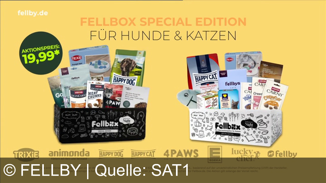 Links und rechts je eine Fellbox, eine für Hunde, eine für Katzen. Oben "Fellbox Special Edition für Hunde & Katzen". Die Boxen enthalten verschiedene Tierprodukte. Links ein Aktionspreis: "19,99*". Unten Markenlogos: Trixie, Animonda, Happy Dog, Happy Cat, 4Paws, Edeka, LuckyChef, Fellby. Hintergrund gelb.