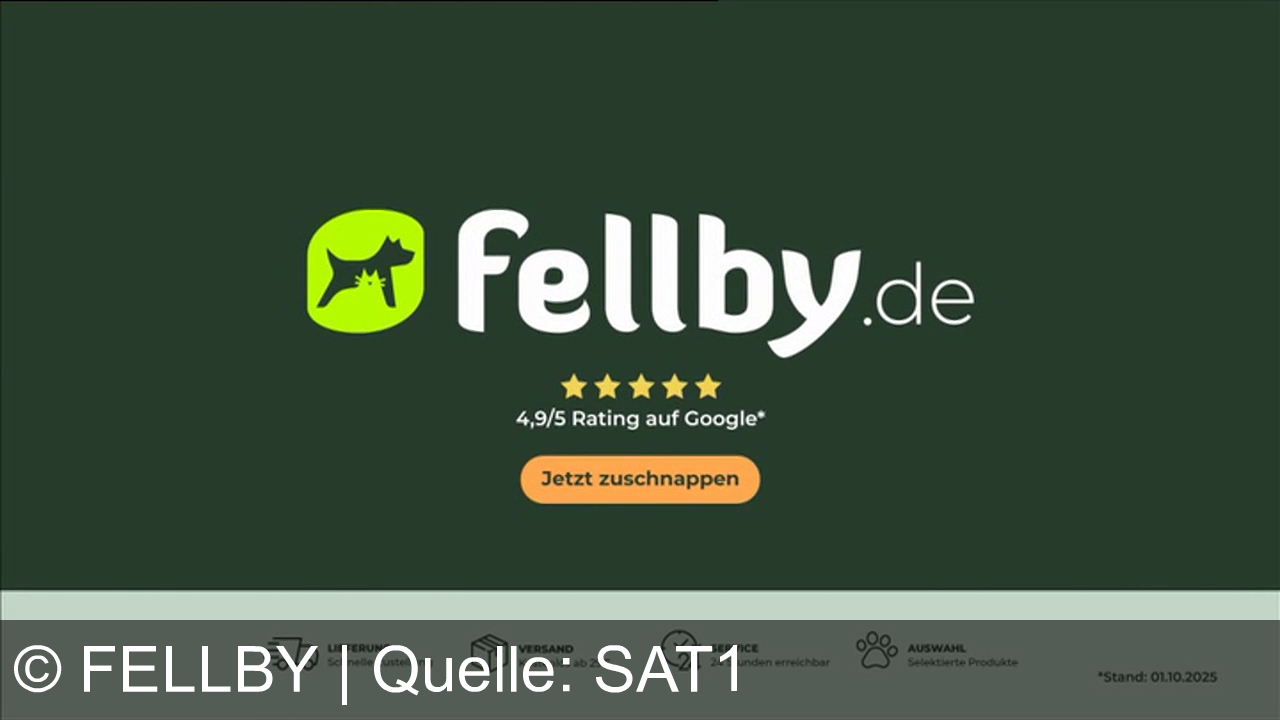 Fellby.de-Logo auf dunkelgrünem Hintergrund. Fünf gelbe Sterne und ein Google-Rating von 4,9/5. "Jetzt zuschnappen"-Button in Orange. Unten Symbole für Lieferung, Versand, Service, Auswahl. Datum: 01.10.2025.