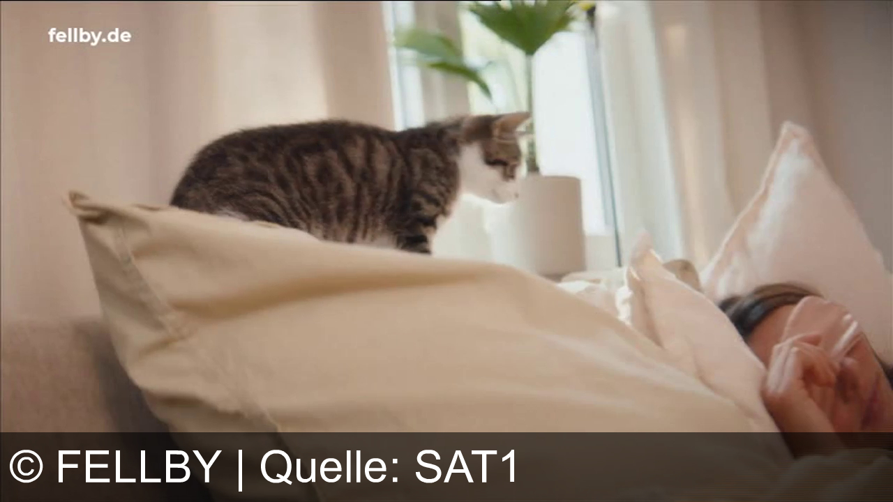 Eine Katze sitzt auf einem Kissen, eine Person liegt daneben mit Schlafmaske im Bett. Im Hintergrund sind ein Fenster und Pflanzen zu sehen. Oben links steht "fellby.de".