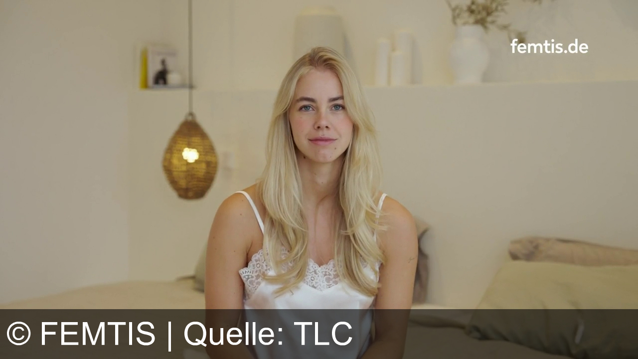 Eine Frau mit langen blonden Haaren sitzt auf einem Bett. Sie trägt ein weißes Top. Im Hintergrund gibt es eine hängende Lampe, ein Regal mit Büchern und weiße Dekorationen. Auf dem Bild steht "femtis.de".