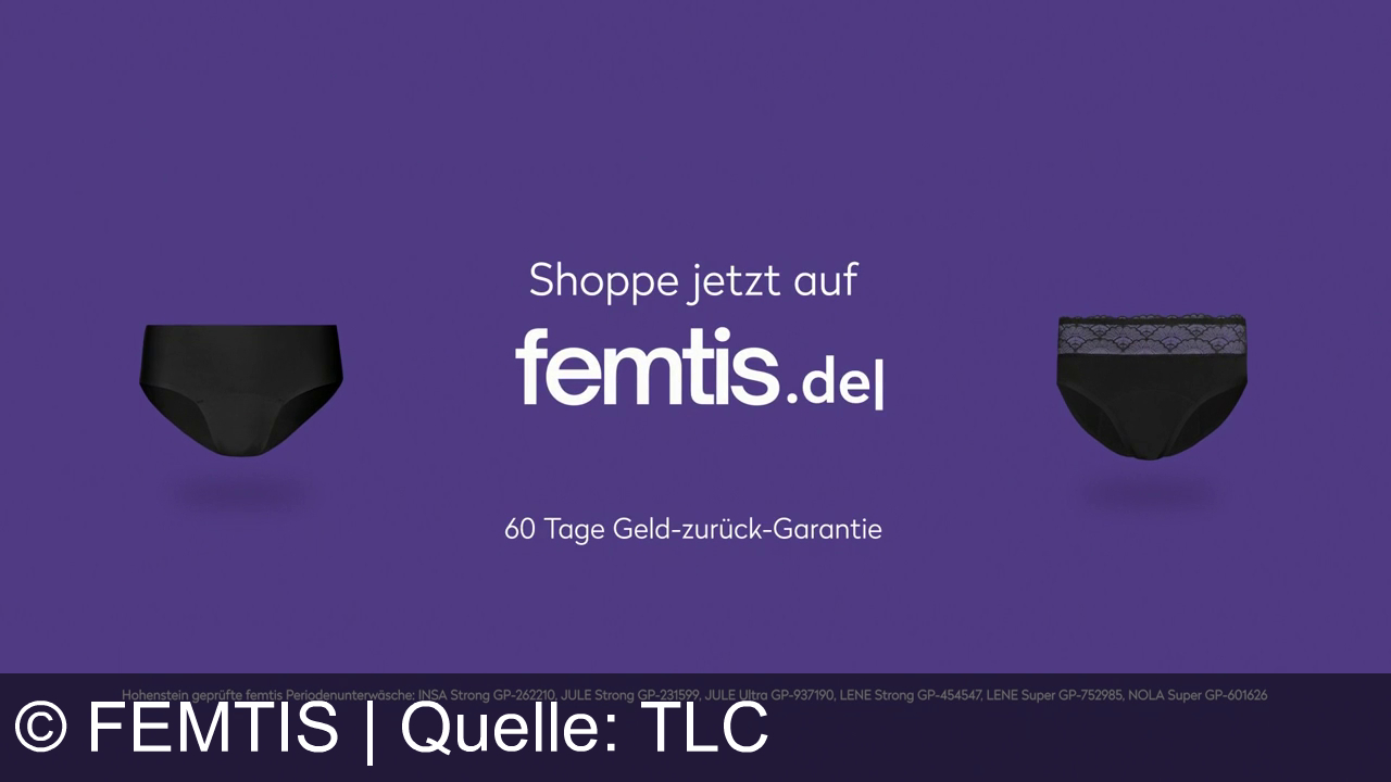 Werbung aus dem Jahr 2026 von Femtis in Deutschland, mit dem von uns gewählten Titel: "Femtis Periodenunterwäsche: Auslaufsicher, komfortabel und mit 60 Tage Geld-zurück-Garantie" mit der Kurzbeschreibung: "Femtis Periodenunterwäsche – geprüft von Hohenstein, maximaler Komfort statt Auslaufen. INSA, JULE, LENE & NOLA jetzt auf femtis.de shoppen – 60 Tage Geld-zurück-Garantie!". Diese Werbung thematisiert oder beinhaltet die Kategorie/n Damenhygiene, Unterwäsche, Slipeinlagen, Tampons, Lingerie.