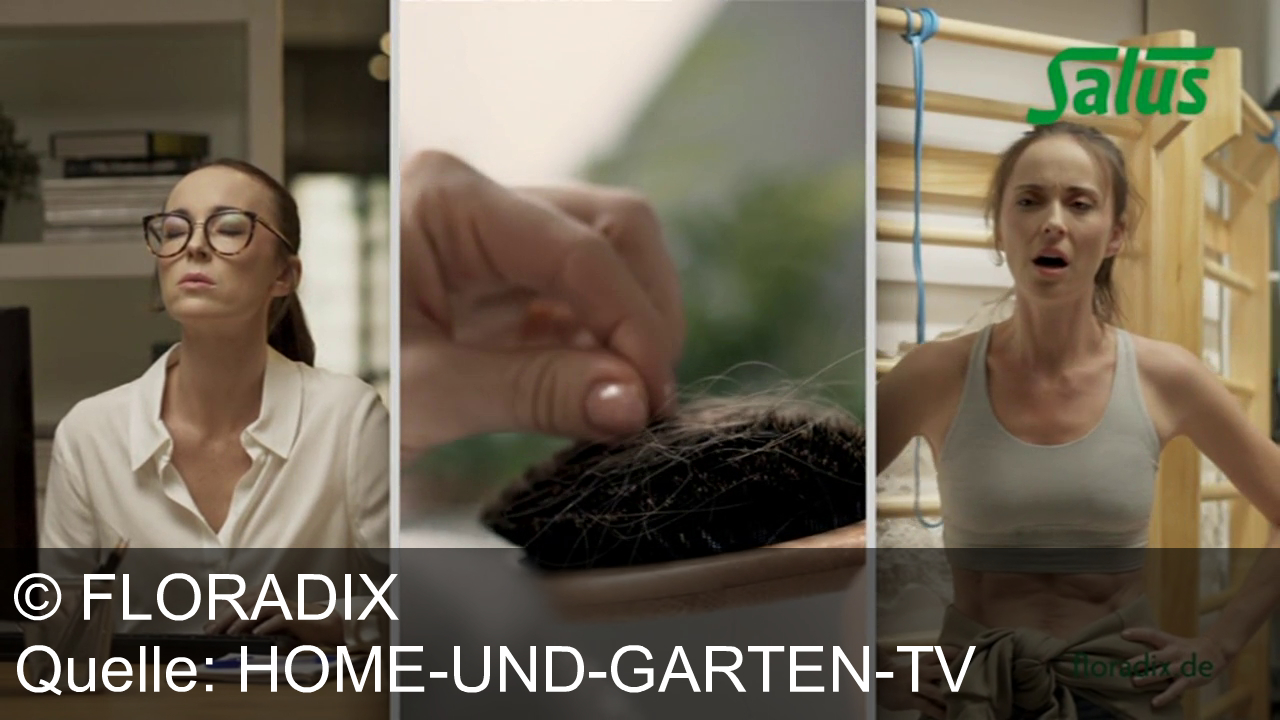 Drei Szenen nebeneinander. Links sitzt eine Frau mit Brille am Schreibtisch, Augen geschlossen. In der Mitte greift eine Hand Haare aus einer Bürste. Rechts steht eine Frau in Sportkleidung, gestützt, schwer atmend. Logo "Salus" oben rechts. Ganz unten "floradix.de".