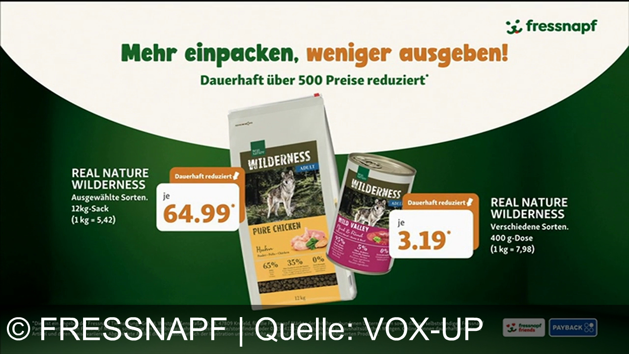 Fressnapf bewirbt ein umfangreiches Sortiment an Tierfutter, wie Real Nature Wilderness, sowie Spielzeug und Zubehör. Die zentrale Werbeaussage fokussiert sich auf die dauerhafte Preissenkung von über 500 Artikeln. Ziel ist es, Kunden dazu zu bewegen, mehr einzukaufen und gleichzeitig weniger auszugeben, um das eigene Zuhause in ein Tierparadies zu verwandeln.