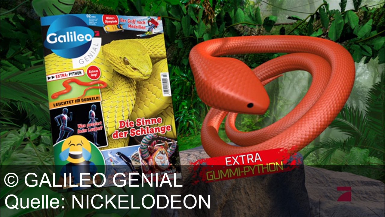 Galileo Genial Werbung aus dem Jahr 2026 in Deutschland, mit dem von uns gewählten Titel: "Galileo Genial: Das Wissensmagazin für Kinder jetzt mit leuchtender Mega-Gummipython am Kiosk" mit der Kurzbeschreibung: "Galileo Genial: Das schlaue Magazin mit Mega-Gummipython, der im Dunkeln leuchtet – Entdecke die faszinierende Welt der Reptilien jetzt am Kiosk.". Diese Werbung thematisiert oder beinhaltet die Kategorie/n Zeitschrift-Magazin.