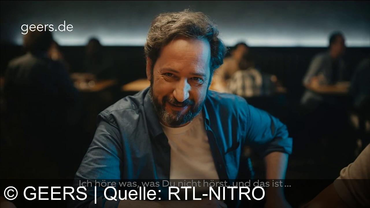 Ein Mann sitzt in einem dunklen Raum an einem Tisch, umgeben von unscharfen Personen im Hintergrund. Er trägt ein blaues Hemd und ein weißes T-Shirt. Oben links ist der Schriftzug "geers.de" eingeblendet. Am unteren Bildrand steht: "Ich höre was, was Du nicht hörst, und das ist..."