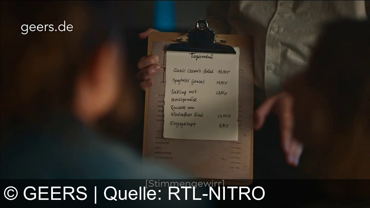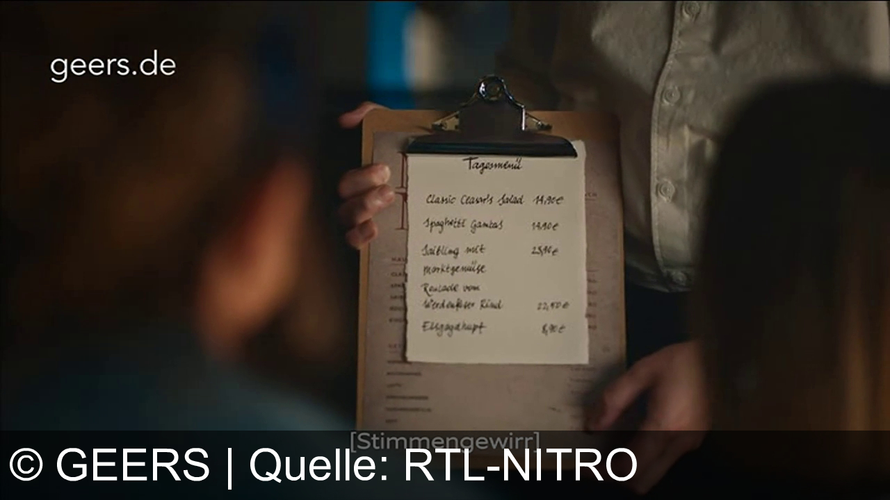 Ein Klemmbrett mit einem handgeschriebenen Tagesmenü wird in der Hand gehalten. Auf dem Menü stehen verschiedene Gerichte mit Preisen in Euro. Im Hintergrund erkennt man einen unscharfen Kopf: die Untertitel zeigen "[Stimmengewirr]". Oben links steht "geers.de".