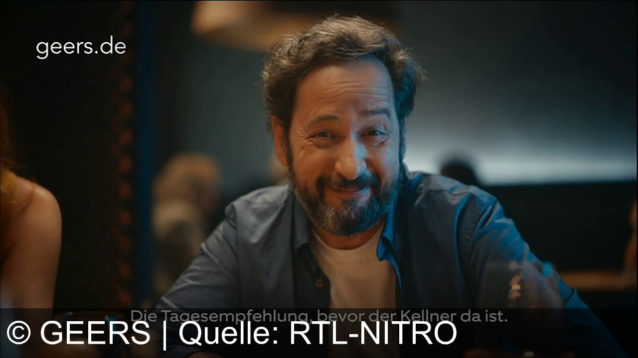 Ein Mann sitzt entspannt in einem Restaurant und lächelt in die Kamera. Er trägt ein dunkelblaues Hemd und hat dunkles Haar mit Bart. Im Hintergrund unscharfe Silhouetten von anderen Personen. Oben links steht "geers.de" und unten rechts der Text: "Die Tagesempfehlung, bevor der Kellner da ist."