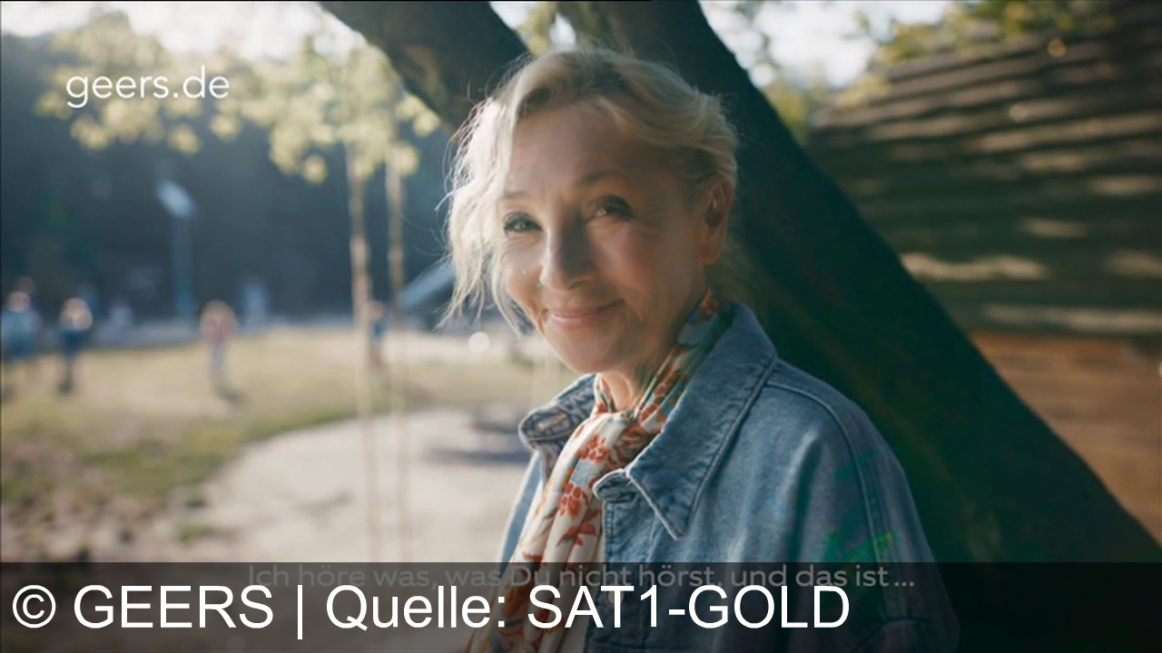 Eine Frau mit blonden Haaren steht draußen und lächelt. Sie trägt eine Jeansjacke und einen gemusterten Schal. Im Hintergrund spielen verschwommene Personen auf einer Wiese. In der oberen linken Ecke steht "geers.de". Unten ist der Text "Ich höre was, was Du nicht hörst, und das ist...".
