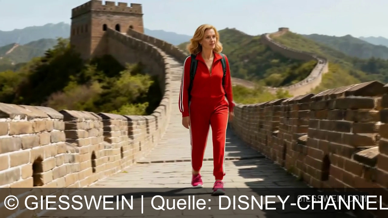 Eine Person geht auf der Großen Mauer in einem roten Trainingsanzug mit pinken Schuhen. Hintergrund zeigt grüne Hügel und Mauerabschnitte. Unten rechts steht "GIESSWEIN.COM".