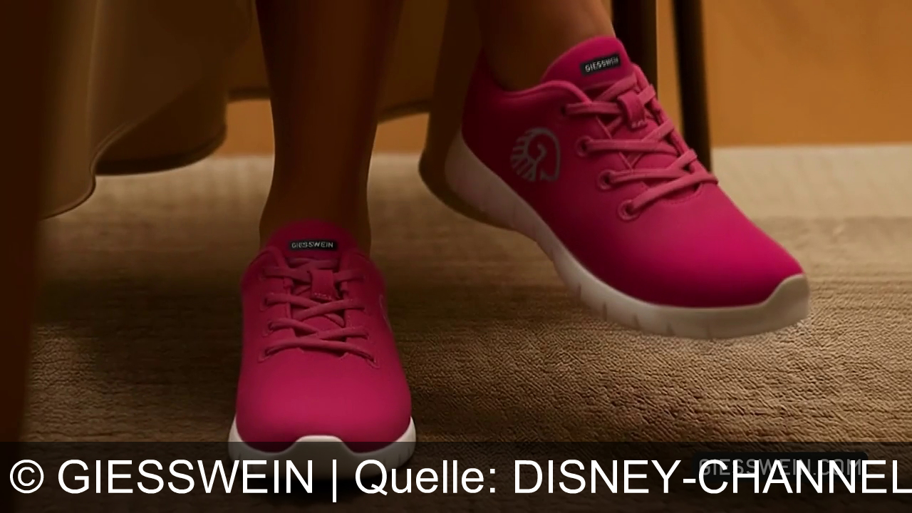 Pinke Sneaker mit weißer Sohle, auf einem Teppichboden. Auf den Schuhen steht "GIESSWEIN". Unten rechts im Bild ist eine Webadresse eingeblendet: "GIESSWEIN.COM".