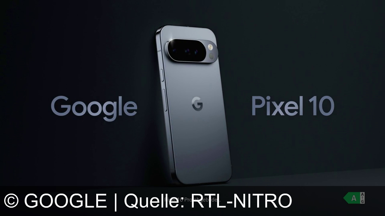 Ein Smartphone ist mittig platziert; über dem Gerät stehen die Wörter "Google" links und "Pixel 10" rechts. Unten im Bild steht "Pixel 10 Pro abgebildet." Das Handy zeigt eine Kamera an der Rückseite. Der Hintergrund ist dunkel. Rechts unten ist ein kleines Symbol mit den Buchstaben "ATG".