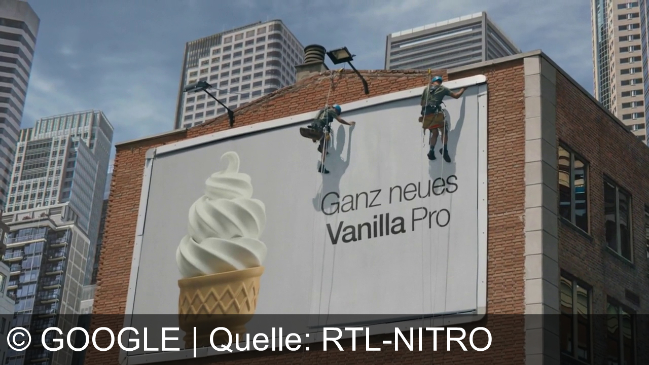 Zwei Personen hängen an Seilen vor einem großen Werbeplakat an einer Backsteinwand. Das Plakat zeigt ein Vanilleeis und den Text "Ganz neues Vanilla Pro". Im Hintergrund sind hohe Gebäude zu sehen.