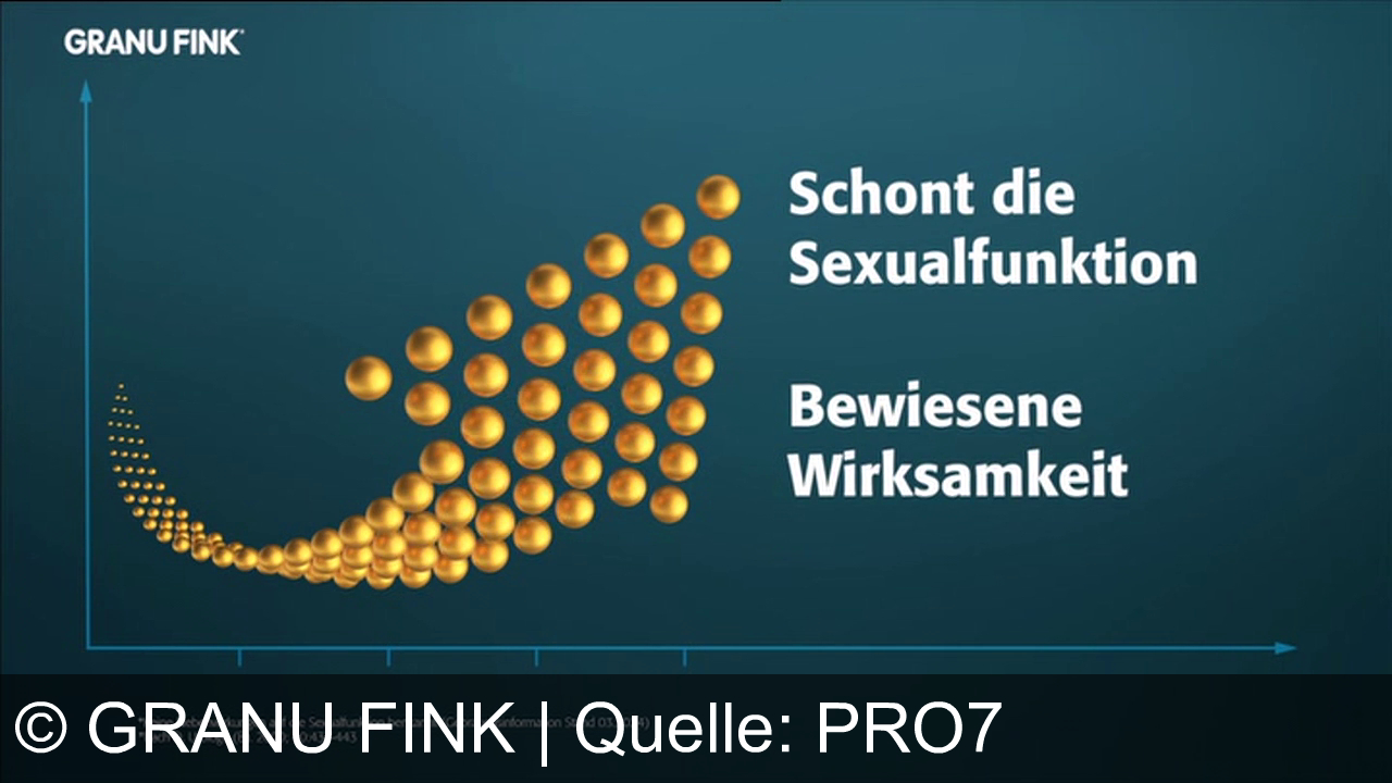 Eine Grafik zeigt gelbe Kugeln in einer aufsteigenden Linie auf einem blauen Hintergrund. Rechts steht der Text "Schont die Sexualfunktion" und "Bewiesene Wirksamkeit". Oben links steht "GRANUFINK". Unten eine kleine Fußnote: "Keine Nebenwirkungen auf die Sexualfunktion bekannt (Gebrauchsinformation Stand 03.2024)" mit Quellenangabe.