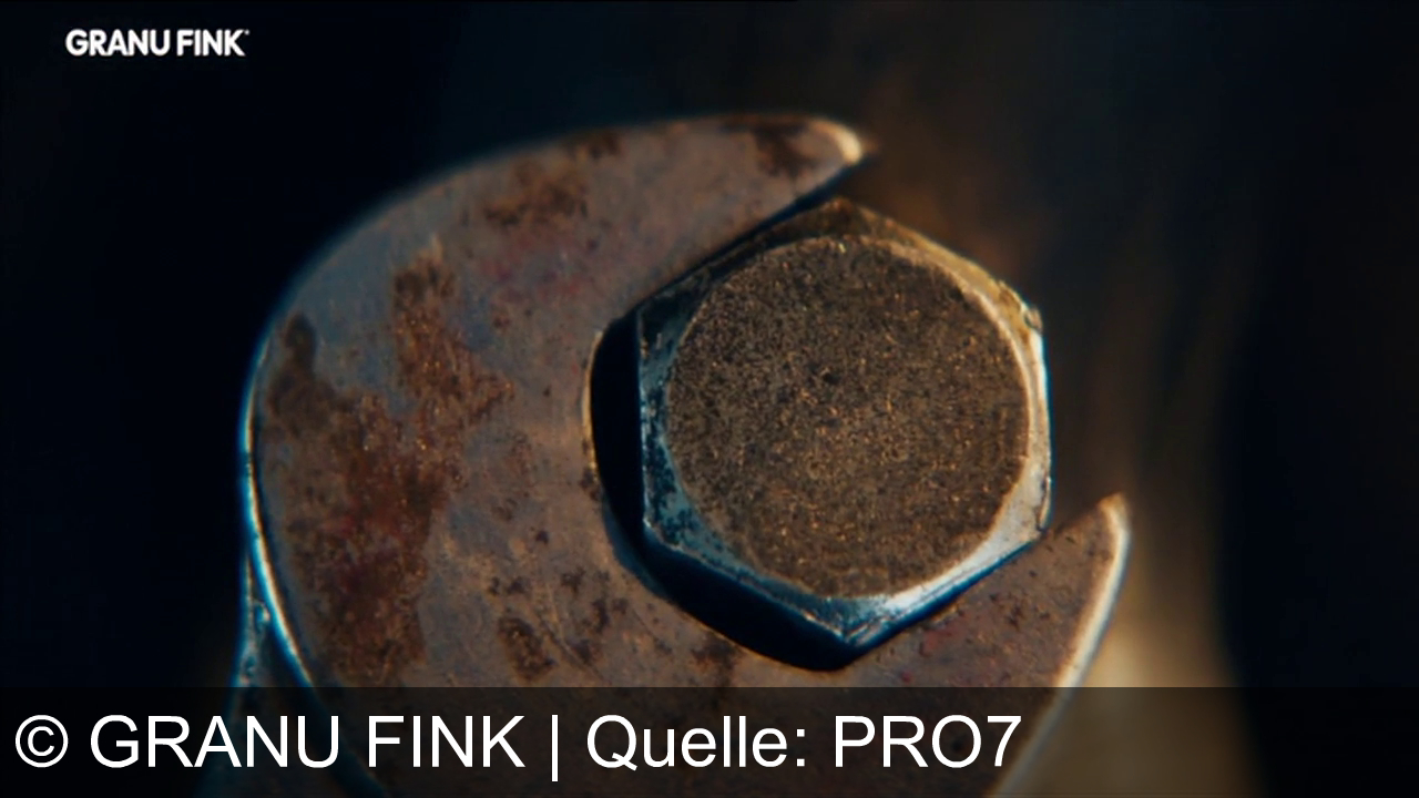 Ein verrosteter Schraubenschlüssel greift eine Mutter. Oben links steht „GRANUFINK“.