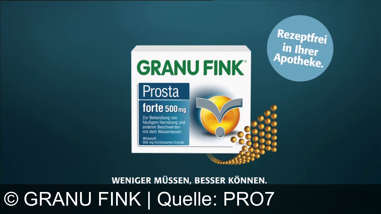 Granu Fink Werbung aus dem Jahr 2026 in Deutschland, mit dem von uns gewählten Titel: "Granufink Prosta forte 500 mg: Natürlich wirksam gegen Prostatabeschwerden und für mehr Lebensqualität" mit der Kurzbeschreibung: "Granufink Prostaforte – natürlich wirksam mit Omega-Kürbis: Hemmt Prostatawachstum, schützt Sexualfunktion. Bewährte Kraft für Männer, rezeptfrei in Ihrer Apotheke!". Diese Werbung thematisiert oder beinhaltet die Kategorie/n Medikamente, Gesundheit, Apotheke.