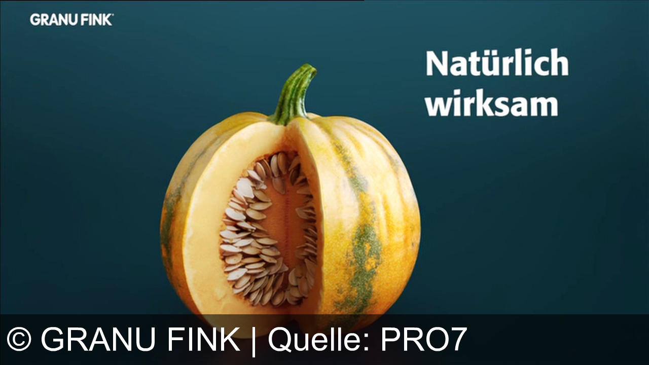 Ein halbierter Kürbis mit Kernen liegt vor einem dunkelgrünen Hintergrund. Links oben steht „GRANU FINK“. Rechts daneben liest man „Natürlich wirksam“.