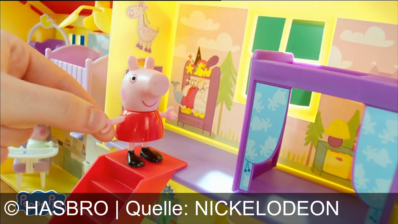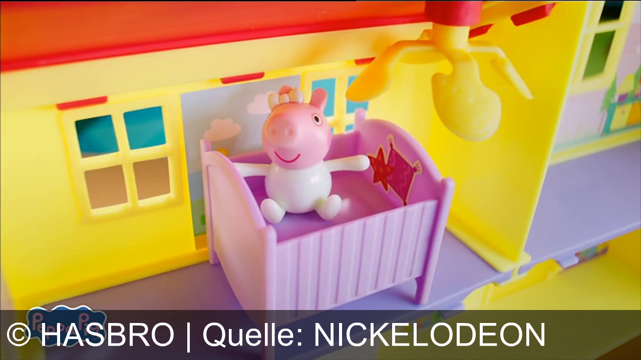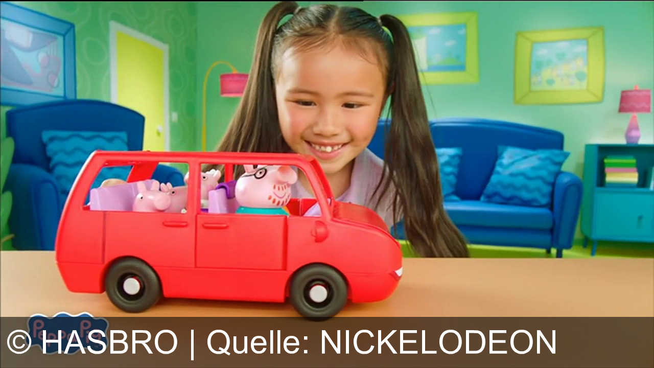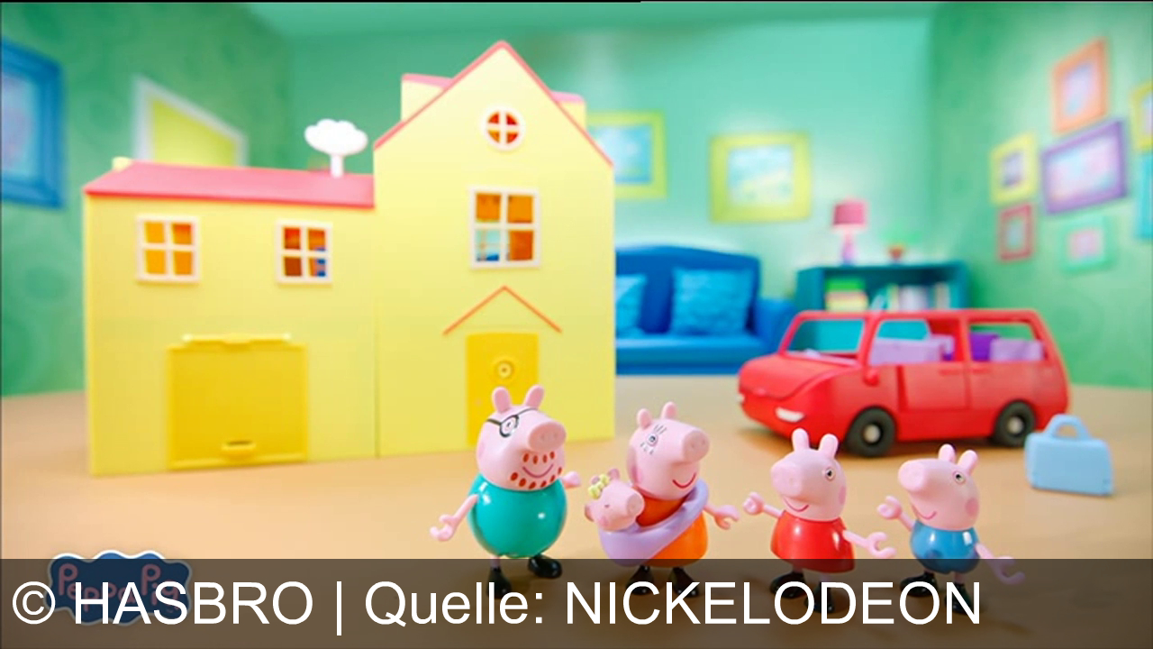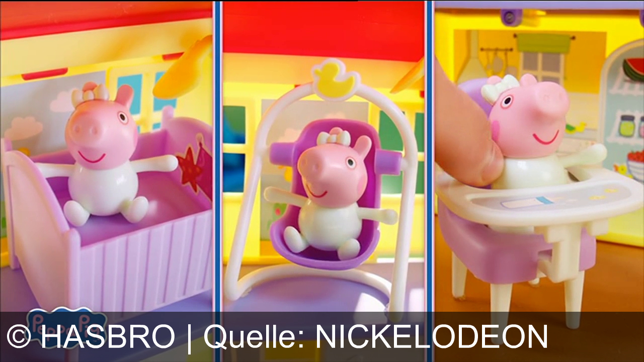 Hasbro bewirbt das farbenfrohe Peppa Pig Spielzeugset mit großem Haus, Figuren und Familienauto. Kinder können Alltagsszenen mit Peppa, Schorsch und Baby Evi nachspielen. Die Werbebotschaft: Vielfältiger, spaßiger Spielspaß für die ganze Familie.