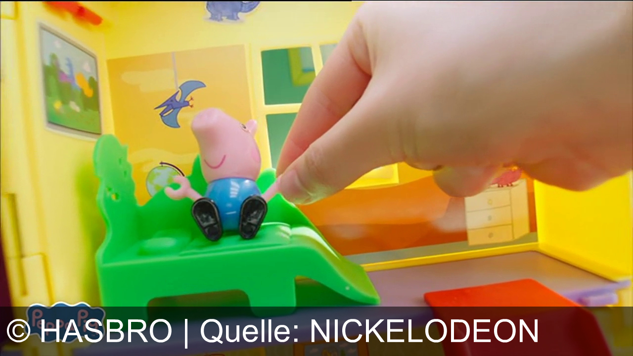 Eine Hand hält eine kleine Figur, die auf einer grünen Rutsche sitzt. Das Zimmer ist gelb mit Wandbildern und einem Fenster im Hintergrund. Unten im Bild ist ein Peppa Pig-Logo.