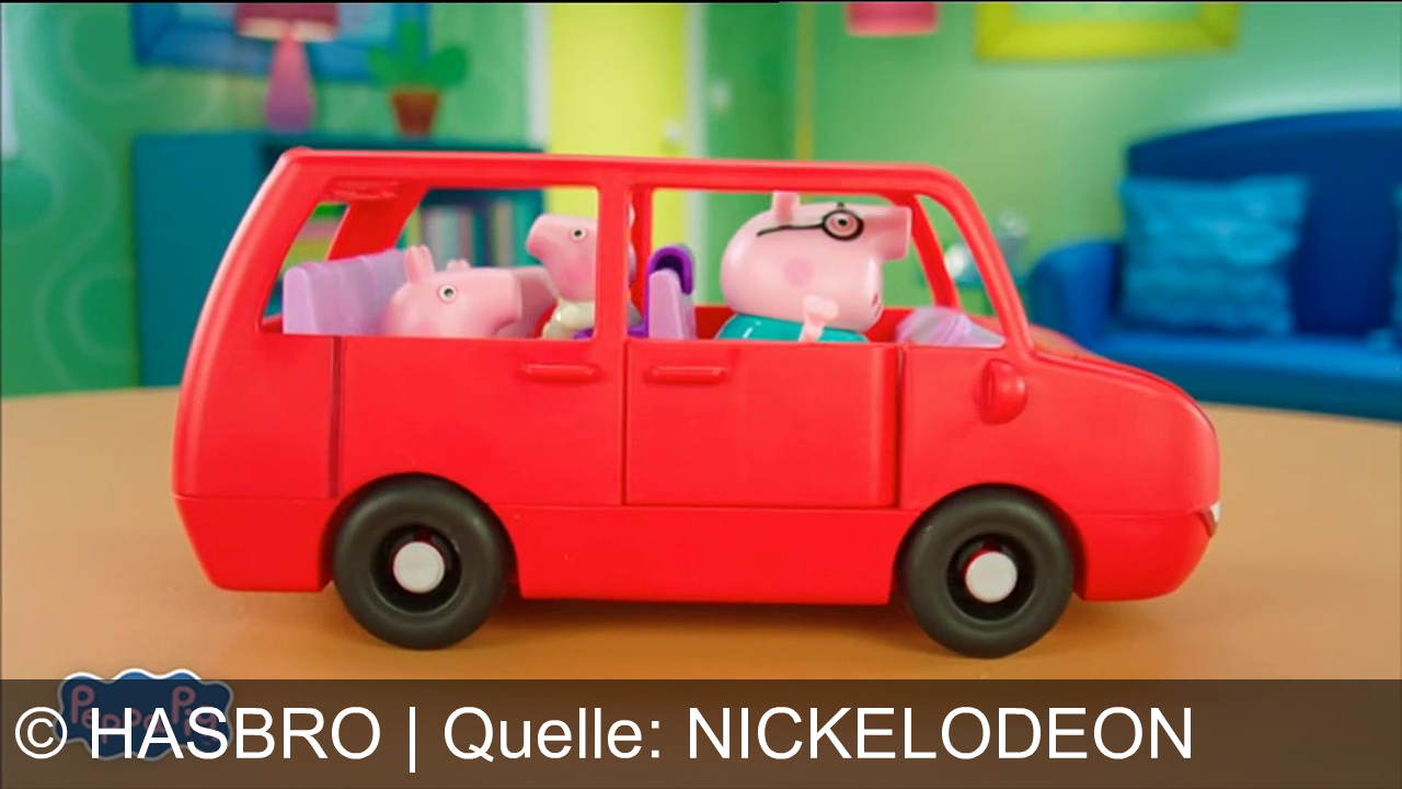 Ein rotes Spielzeugauto mit Figuren von Tieren. Die Figuren sitzen im Auto. Im Hintergrund sind bunte Wände und Möbel zu sehen. Unten links steht ein Logo mit dem Schriftzug "Peppa Pig".