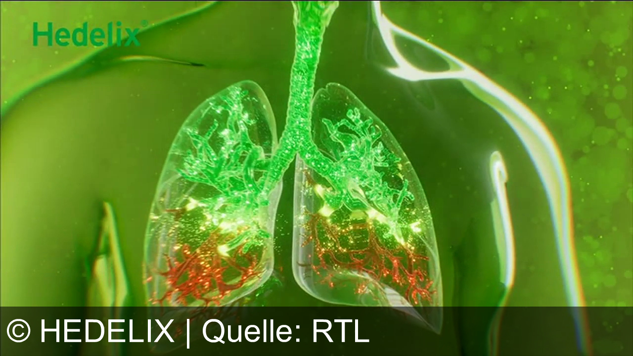 Grüne Hintergrundszene mit leuchtenden Lungen in der Mitte. Die Lungen haben grüne und rote Gefäßstrukturen, die leuchten. Links oben steht "Hedelix". Die Szene wirkt digital animiert mit Pflanzenmotiv.