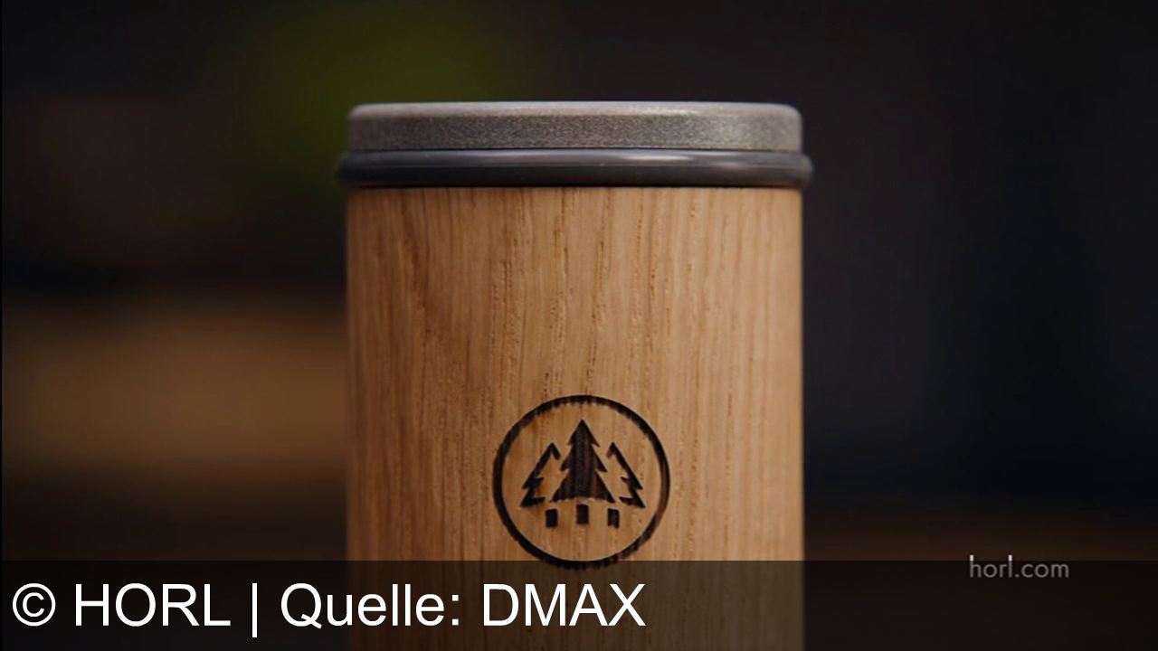 Ein zylinderförmiges Objekt aus Holz mit einem gelaserten Logo bestehend aus drei Tannenbäumen in einem Kreis. Der Deckel scheint aus Metall zu sein. Unten rechts steht "horl.com". Der Hintergrund ist unscharf und dunkel.