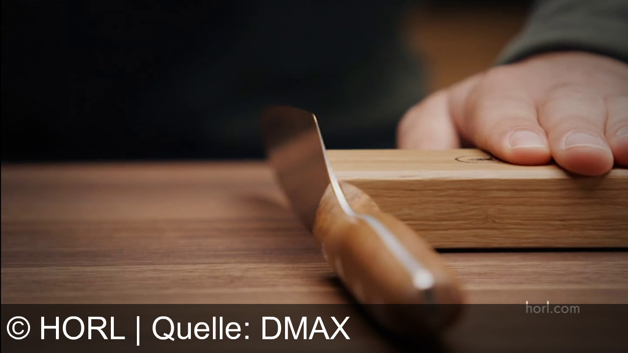 Ein Messer liegt auf einem Holztisch. Der Griff des Messers ist aus Holz. Eine Hand hält ein kleines Holzbrett fest. In der rechten unteren Ecke steht die Webseite "horl.com".