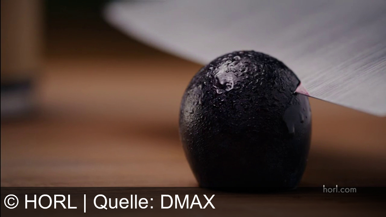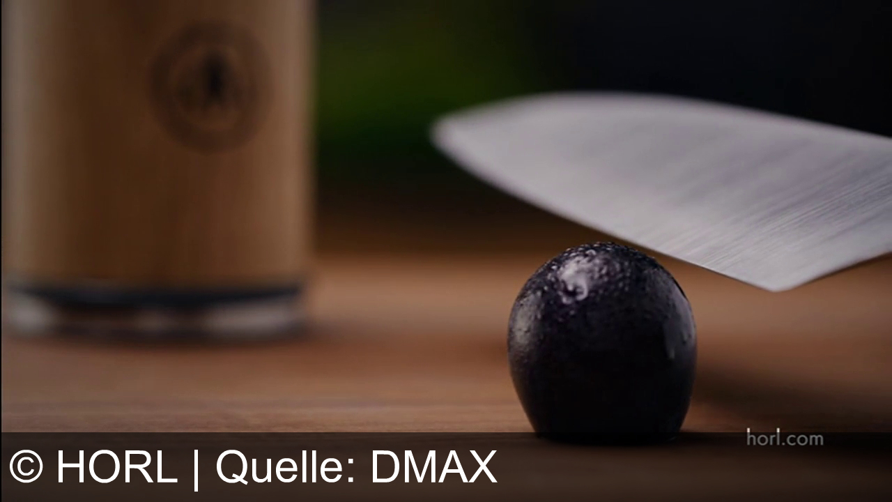 Ein Messer schneidet eine schwarze Olive auf einem Holzbrett. Im Hintergrund ist ein zylindrisches Objekt zu sehen. Unten rechts steht "horl.com".