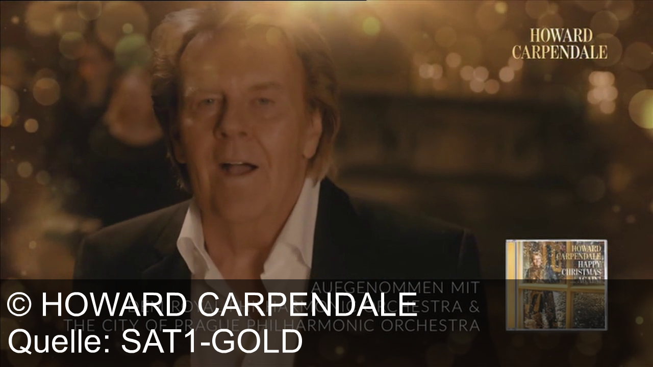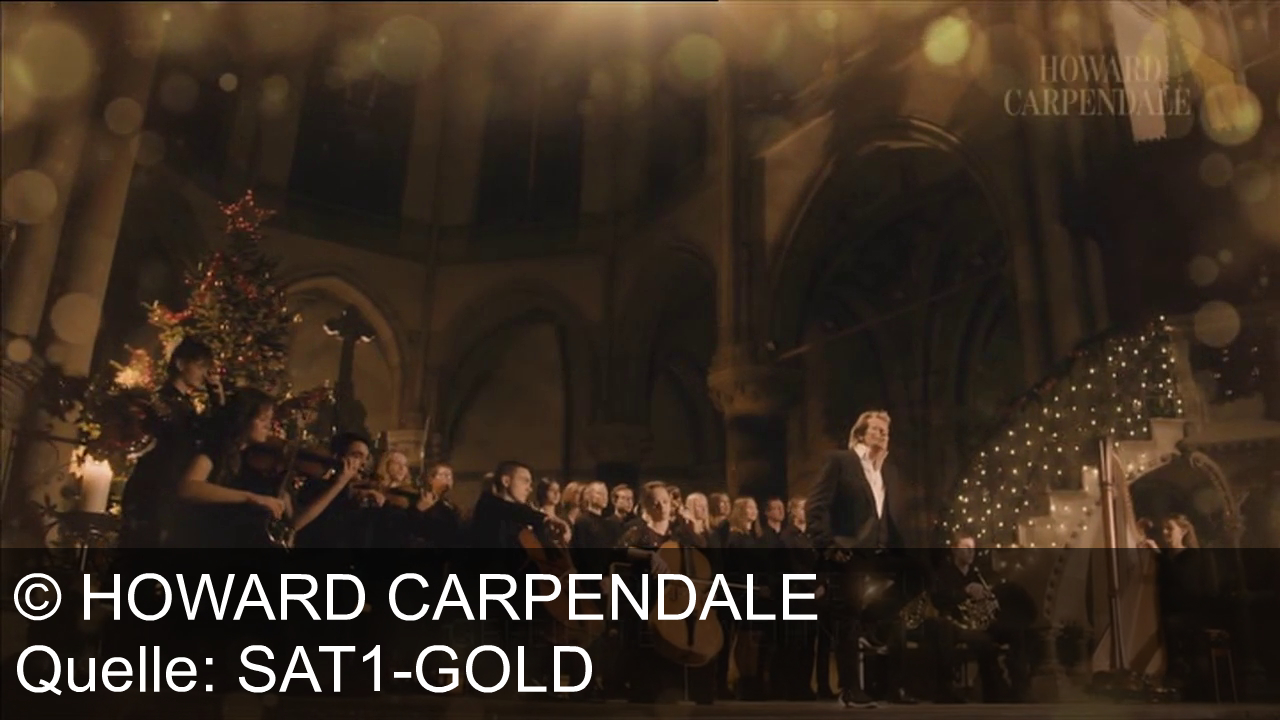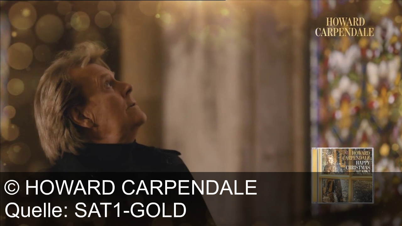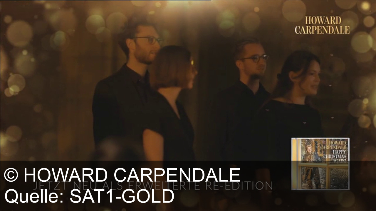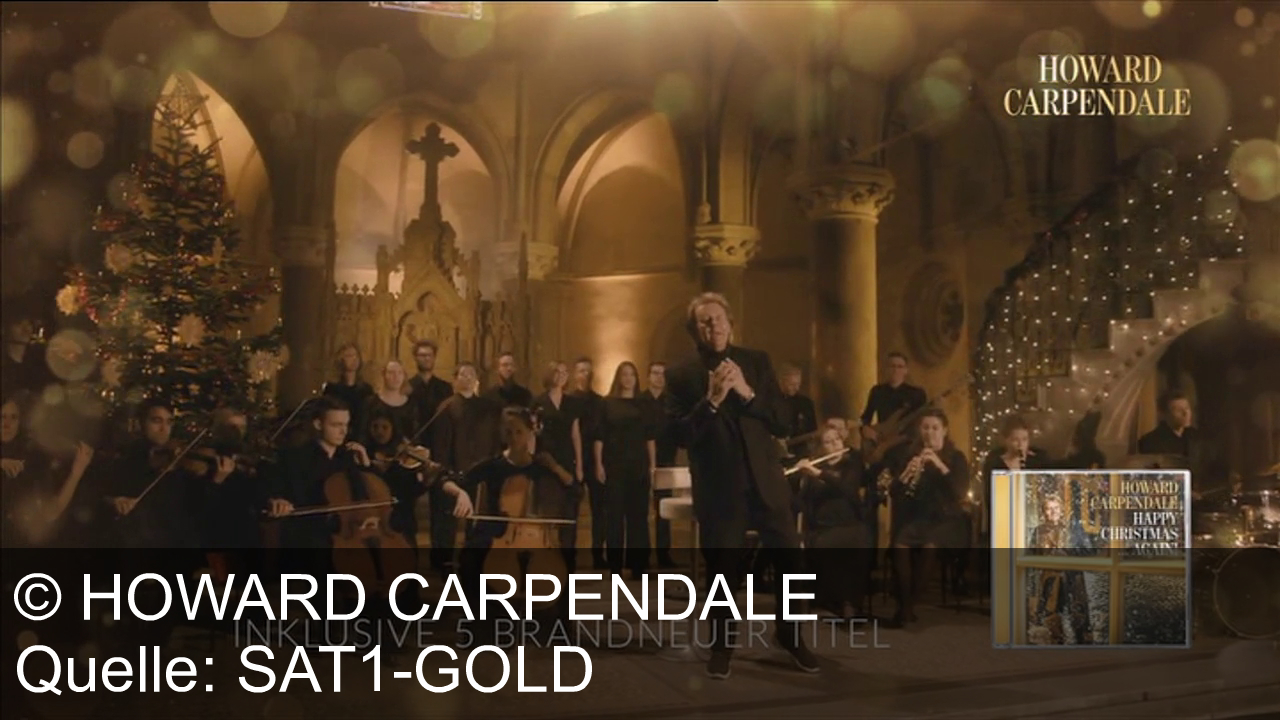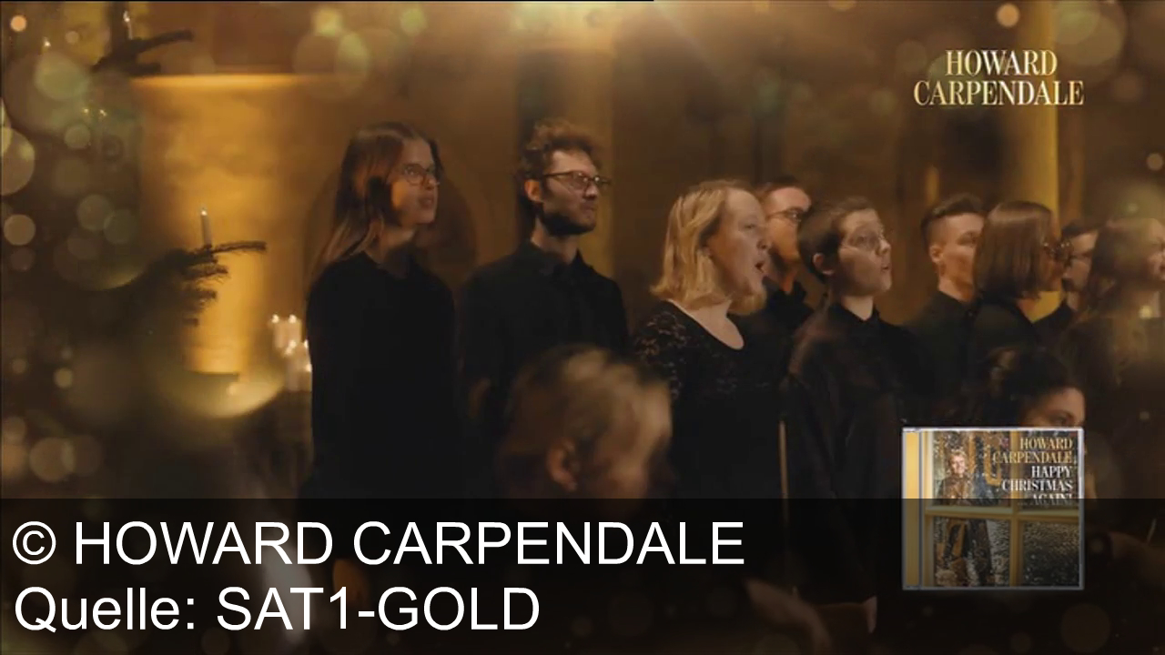 Ein Chor in schwarzer Kleidung steht in einem festlich beleuchteten Raum. Einige Mitglieder singen. Im Vordergrund ein weihnachtlich geschmückter Baum. Oben rechts steht "Howard Carpendale". Unten rechts ist ein kleines Bild mit einem Albumcover, darauf auch "Howard Carpendale - Happy Christmas Again". Goldene Lichteffekte umrahmen die Szene.
