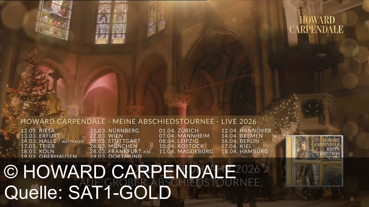 In einem großen, festlich geschmückten Raum mit hohen Fenstern stehen Musiker. Eine Liste mit Tourdaten für Howard Carpendales Abschiedstournee 2026 und die Ankündigung einer großen Frühjahrstour werden angezeigt. Rechts unten ist ein Albumcover zu sehen. Weihnachtliche Beleuchtung und Dekorationen sind erkennbar.