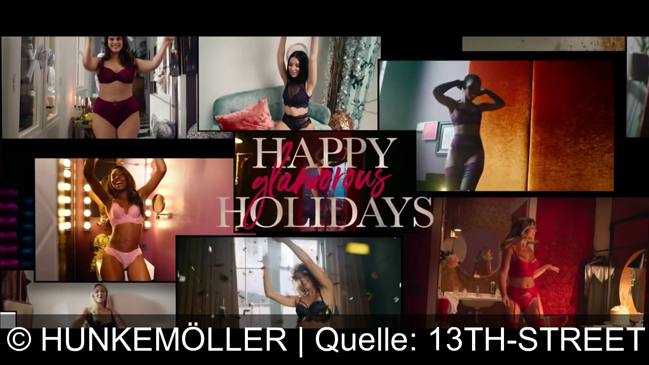 Im TV-Spot "Happy glamorous holidays" von Hunkemöller (erstmals ausgestrahlt am 29.11.2020) wird festliche und glamouröse Unterwäsche für die Feiertage beworben. Die Werbeaussage: Stilvolle Dessous sorgen für Selbstbewusstsein und Lebensfreude – jetzt in Stores und online erhältlich.
