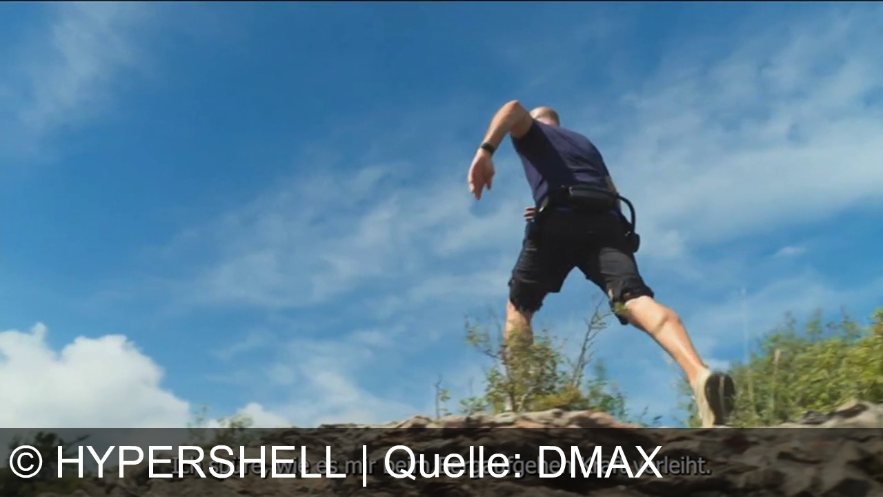 Ein Mann klettert über felsigen Boden nach oben, trägt Shorts, T‑Shirt und einen kleinen Rucksack. Über ihm ist klarer Himmel mit ein paar Wolken, rundherum stehen niedrige Büsche. Untertitel laufen am unteren Bildrand.