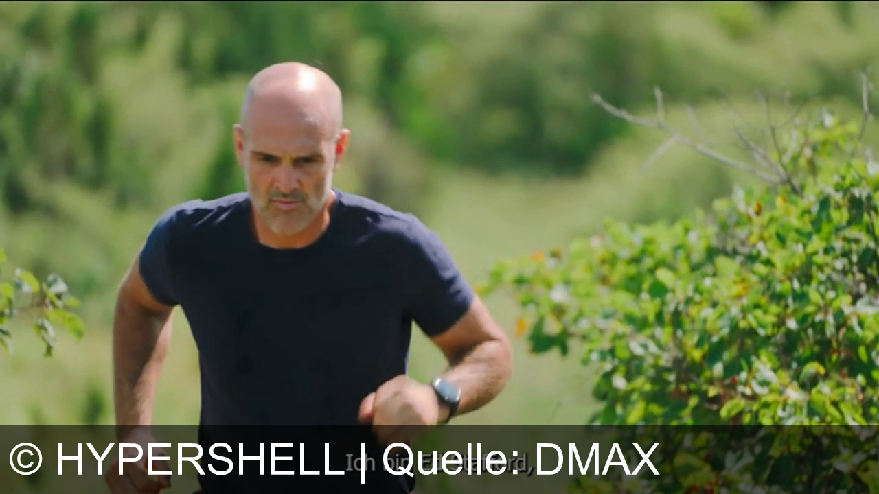 Ein Mann mit Glatze joggt draußen durch grünes Gelände. Er trägt ein dunkles T‑Shirt und eine Uhr am linken Handgelenk. Untertitel laufen am unteren Bildrand.