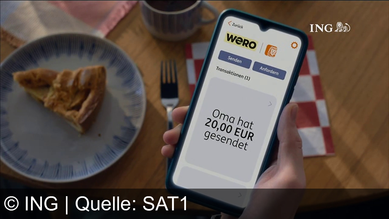 Werbung aus dem Jahr 2026 von Ing in Deutschland, mit dem von uns gewählten Titel: "Einfach Geld per Handynummer überweisen mit dem kostenlosen Girokonto und Wero von ING" mit der Kurzbeschreibung: "Gemeinsam genießen, einfach Geld senden – mit ING, Vero und dem kostenlosen Girokonto. "Mama, er verdient doch sein eigenes Geld." Geld per Handynummer überweisen mit Wero und dem kostenlosen Girokonto der ING.". Diese Werbung thematisiert oder beinhaltet die Kategorie/n Bank, Finanzen, Apps, Handy-Smartphone.