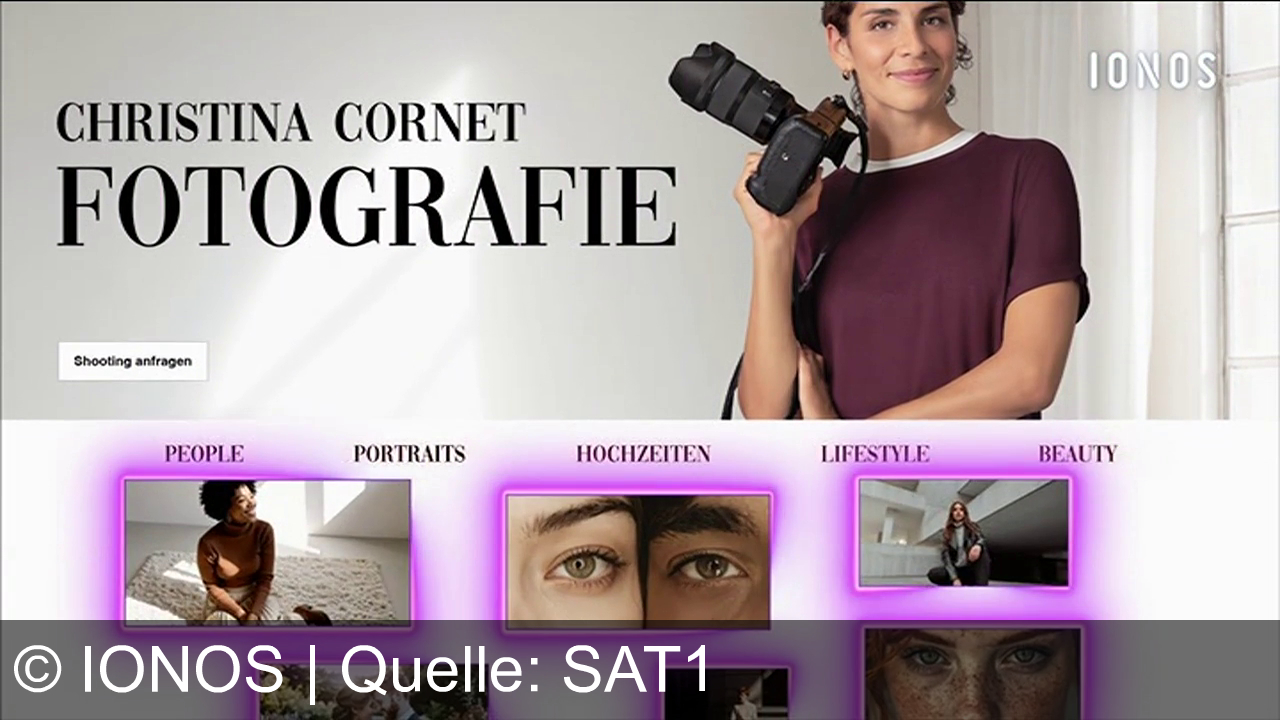 Eine Person hält eine Kamera. Links steht "Christina Cornet Fotografie". Ein Button zeigt "Shooting anfragen". Unten Kategorien: People, Portraits, Hochzeiten, Lifestyle, Beauty, mit kleinen Fotos darunter. Rechts oben steht "IONOS".
