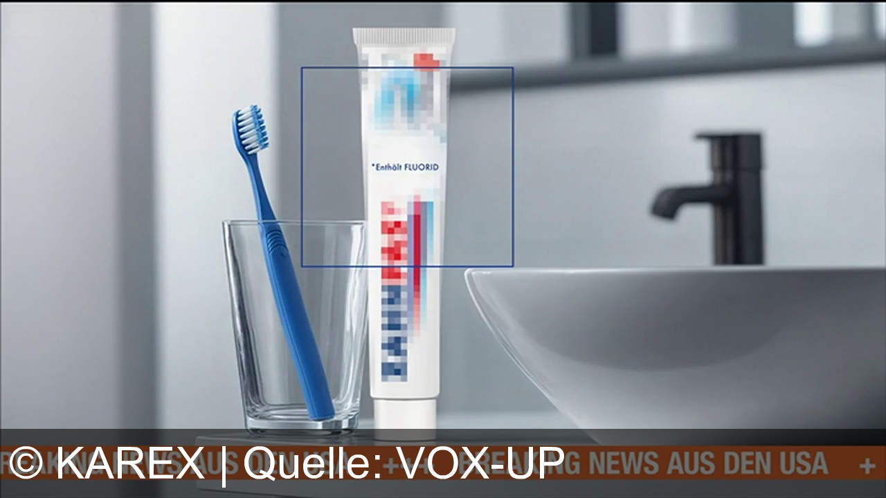 Eine Zahnbürste steht in einem Glas, daneben eine Tube Zahnpasta auf einem Waschbecken. Im Hintergrund ein Wasserhahn. Unten im Bild ein Nachrichtenbanner mit "Breaking News aus den USA".