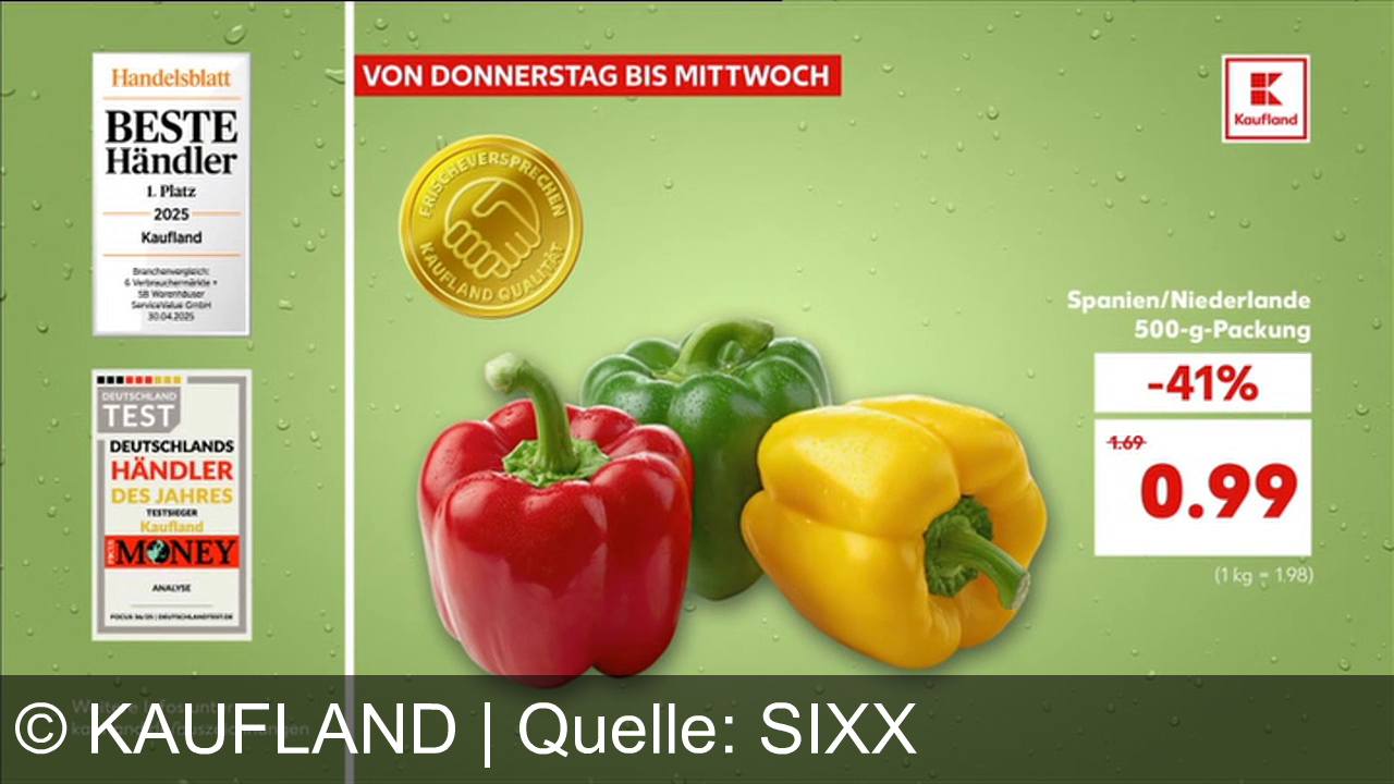 Drei Paprika in Rot, Grün und Gelb. Links Anzeigen für Auszeichnungen von Kaufland. Ein goldener Sticker mit Frischeversprechen. Rabatt von 41% auf 500-g-Paprika aus Spanien/Niederlande, Preis 0,99 €. Von Donnerstag bis Mittwoch gültig. Hintergrund in hellem Grün mit Wassertropfen. Kaufland-Logo oben rechts.