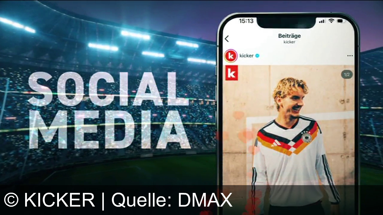 Ein Stadion leuchtet im Hintergrund, im Vordergrund steht „SOCIAL MEDIA“ in großen Buchstaben. Rechts ist ein Smartphone-Bildschirm mit einem Social-Media-Post zu sehen. Der Post zeigt eine lächelnde Person in einem Retro-Fußballtrikot. Das Profil „kicker“ ist markiert, es ist 15:13 Uhr.