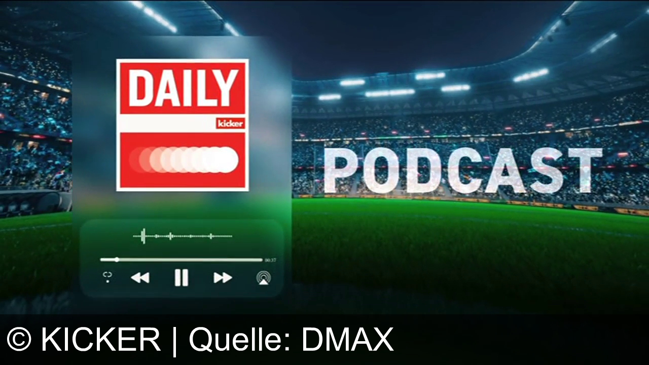 Ein Stadion mit Flutlicht erleuchtet, Tribünen voller Menschen. Der Text "DAILY" und "PODCAST" in großer Schrift zu sehen. Links ein Audioplayer mit Play-Button und Fortschrittsanzeige.