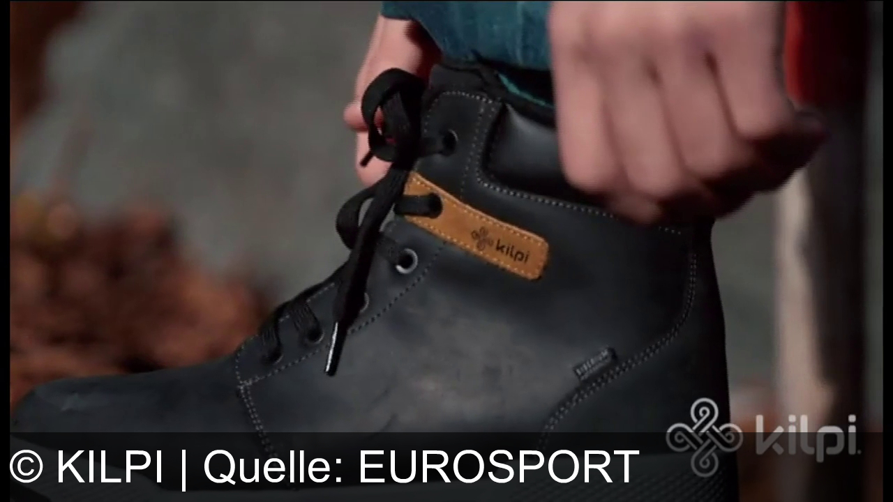 Eine Hand bindet die schwarzen Schnürsenkel eines schwarzen Stiefels. Der Stiefel hat ein braunes Logo mit dem Schriftzug "kilpi". In der unteren rechten Ecke befindet sich ein weiteres "kilpi" Logo. Im Hintergrund sind unscharfe Blätter zu sehen.