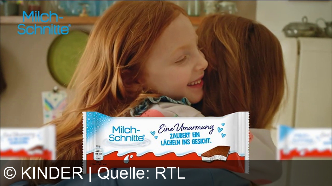Ein Mädchen mit roten Haaren umarmt eine andere Person. Sie lächelt glücklich. Im Vordergrund ist eine Verpackung von Milch-Schnitte mit der Aufschrift „Eine Umarmung zaubert ein Lächeln ins Gesicht“. Links oben steht das Milch-Schnitte-Logo. Im Hintergrund sind verschwommene Küchenutensilien zu sehen.