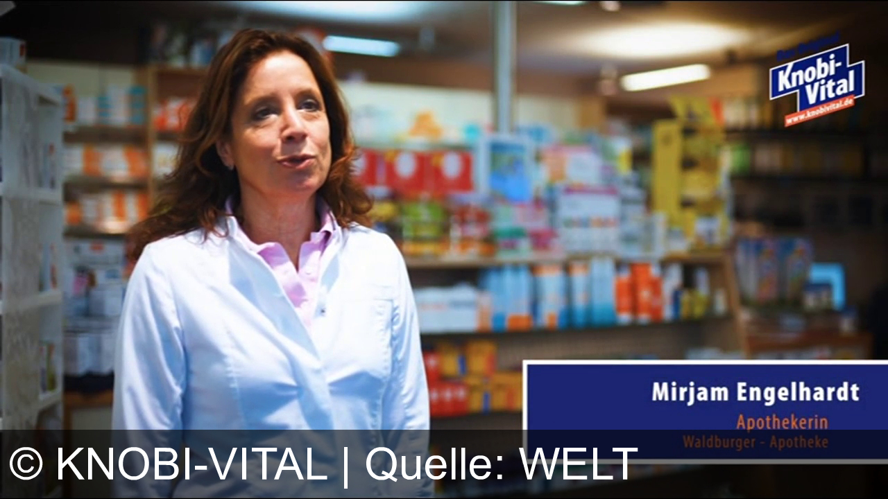 Eine Frau steht in einem Geschäft oder einer Apotheke, sie trägt einen weißen Kittel. Im Hintergrund sind Regale mit bunten Produkten. Rechts unten ein blaues Feld mit dem Namen "Mirjam Engelhardt" und der Bezeichnung "Apothekerin, Waldburger-Apotheke". Oben rechts steht "Knobi-Vital" mit Webseite.